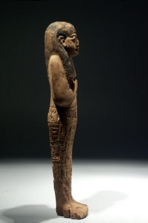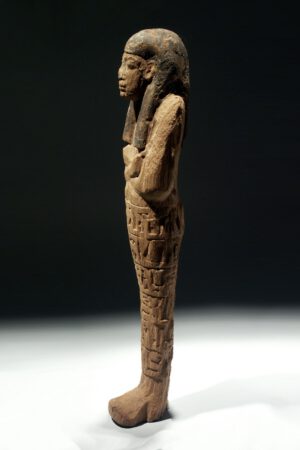 Shown mummiform, crossed hands protruding from wrappings, wearing black tripartite wig, six horizontal lines of incised hieroglyphic text with the name of the owner Aset and part of the spell of the Book of the Dead, spell 6, calling the ushabti to answer when needed to do the work in the hereafter