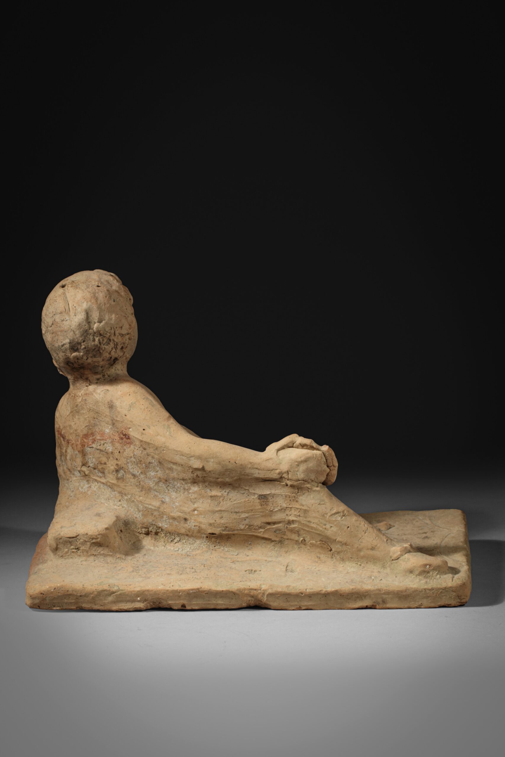 Recumbent child leaning on rectangular cushion, holding patera umbilicata in his right hand; draped around lower body. Set on large rectangular plinth, small, square vent hole on top of head. Pale, orange-beige clay with traces of red paint. Small piece missing from drapery, tiny chip from patera, otherwise intact.
