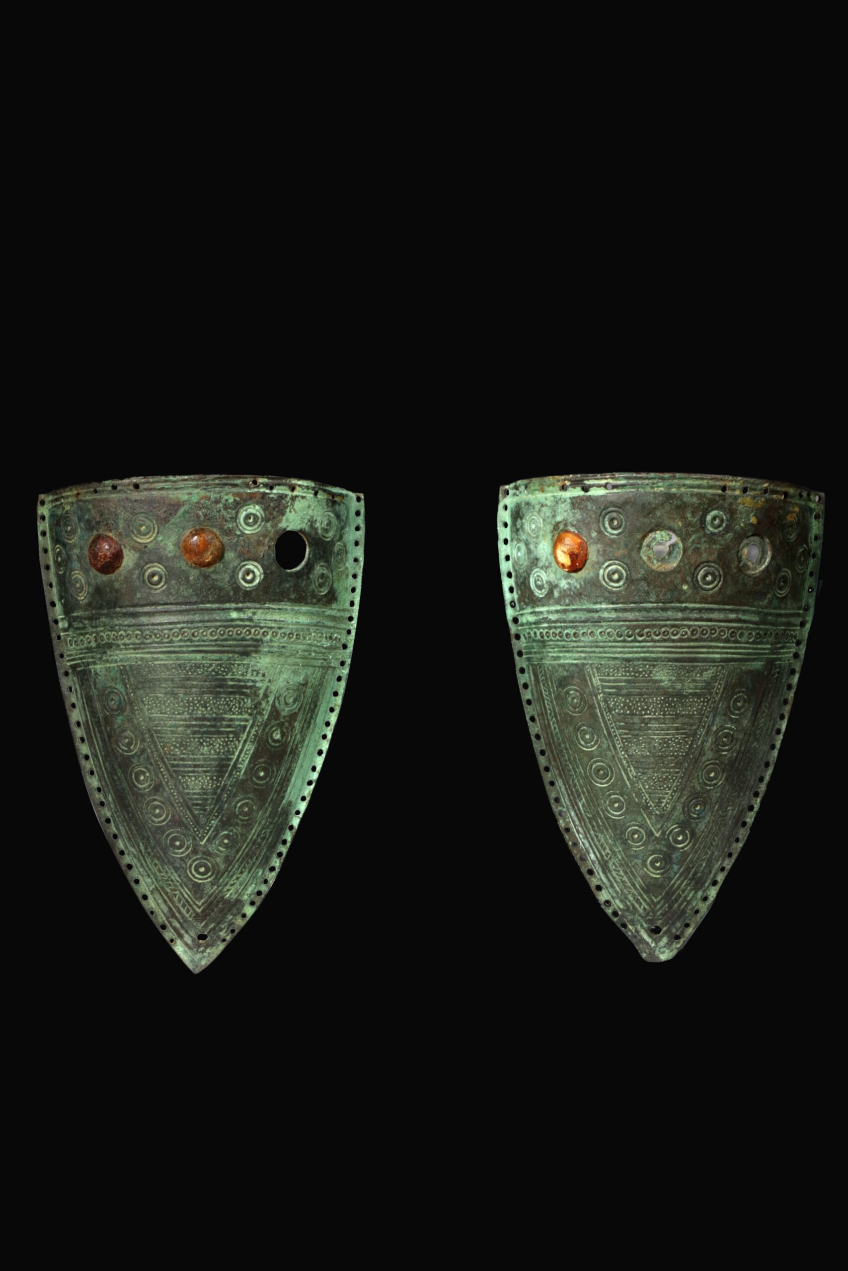 Pair of armour, probably triangular and convex shaped shoulder pieces, the edges perforated for fastening, incised geometric decoration of concentric circles and lines, each piece with three roundels at the top inlaid with amber