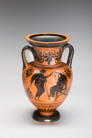 Side A: scene of a man, dressed in chiton with mantle, leaning on a stick, his right arm stretched out in a greeting gesture to a woman, seated on a folding stool, holding a flower to her face. Side B: both figures seated in a more intimate setting, while he is touching her shoulder and arm, she is putting her left arm on his thigh, still holding the lotus flower in her right hand. Palmette in lower field at either side, design of linked palmettes with central lotus bordering the scenes; alternating linked palmettes on neck, row of tongues on shoulder; dotted border below scenes, rays above base.