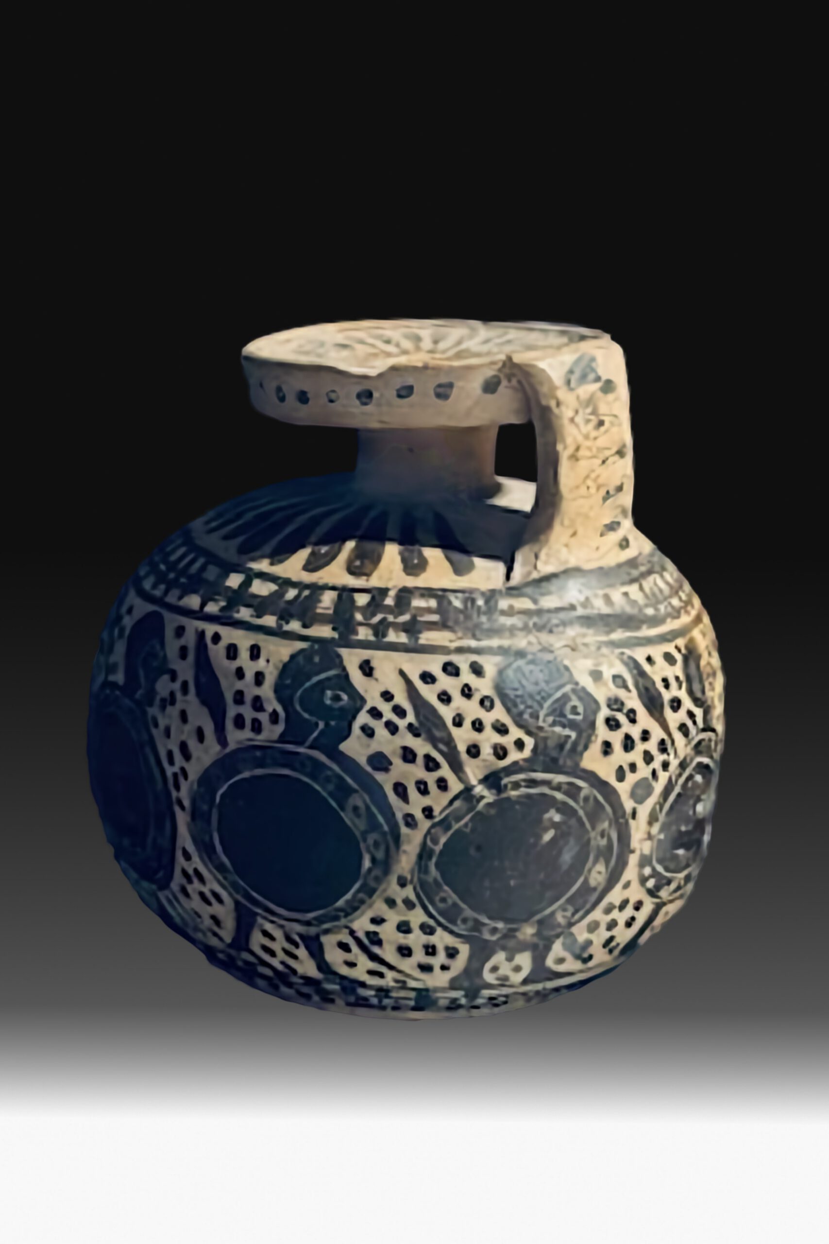 Sperical body decorated with five helmeted and bearded warriors carrying large red shield and spear