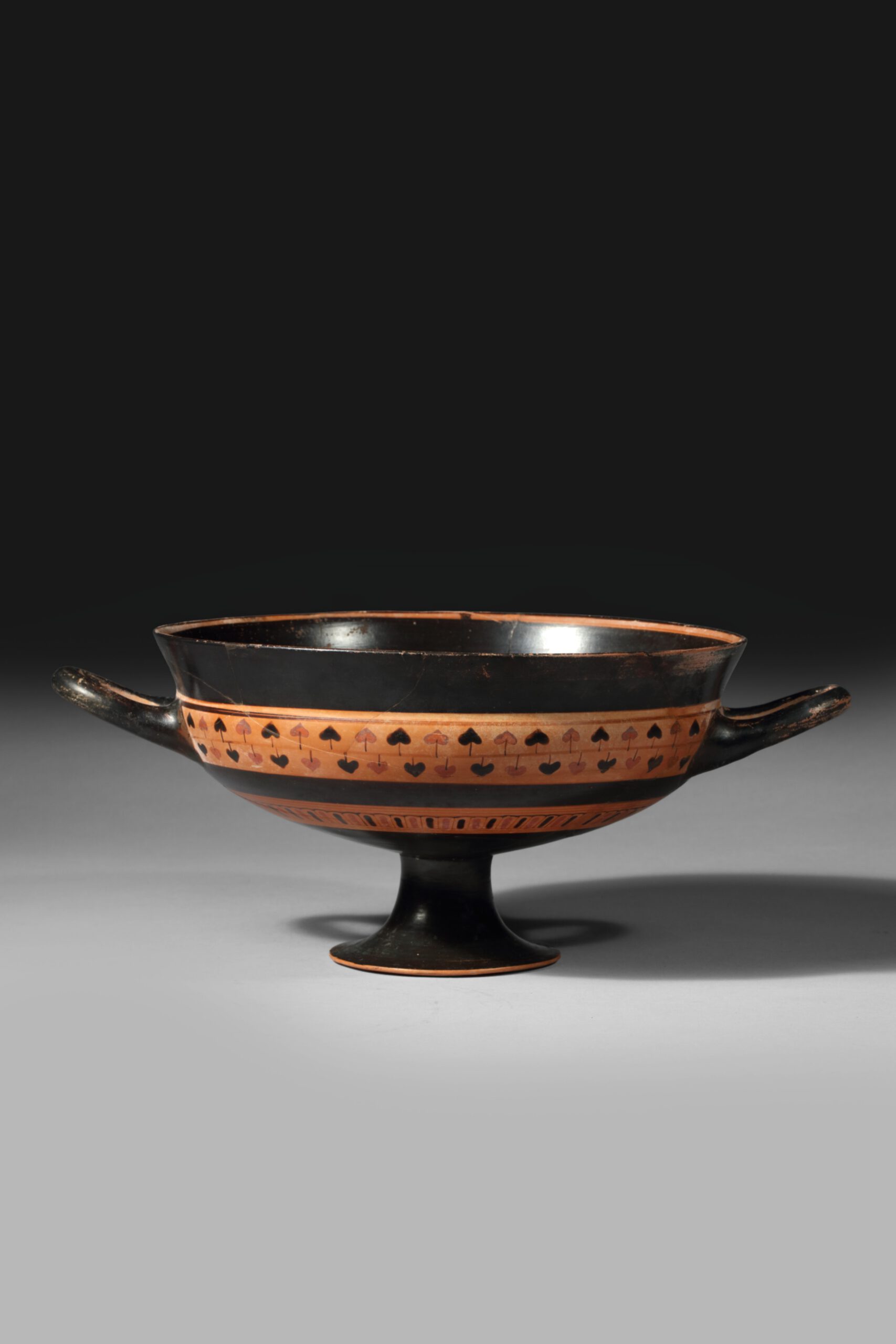 Band cup shape, body between the black handles decorated with central band of opposite ivy- wreath with straight stems and stalks, leaves alternating in red and black, broad black band above and below, reserved stripe inside of lip, inside completely black; tongue-band on lower part of body, alternating in red and black, within pairs of red lines; black stem and foot, underside reserved with circular line in black