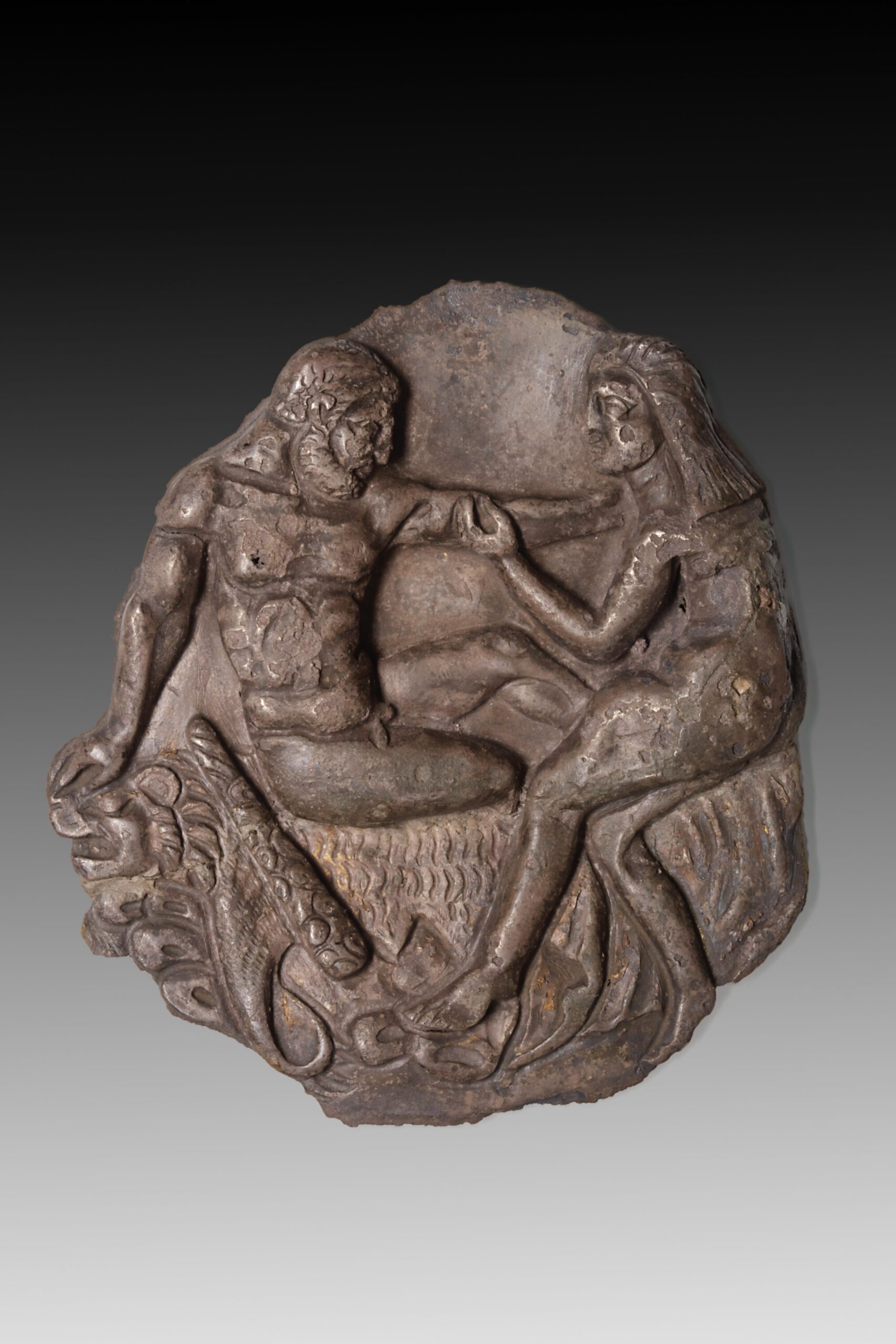 Silver-gilt, representation in repoussé technique of Herakles trying to seduce Auge, daughter of the Greek king Aleos. Both naked, bearded Herakles, being drunk, is seated on his lion’s skin with his club next to him, seizing Auge by the neck, while she is trying to escape by defending herself with her left arm.