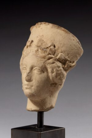 Head turned in frontal¾ view to the left, her wavy hair parted in the middle, stephanos/ or diadem with decorated with wreath of ivy leaves on top. Pale beige clay with small mica particles and traces of black and red paint on wreath