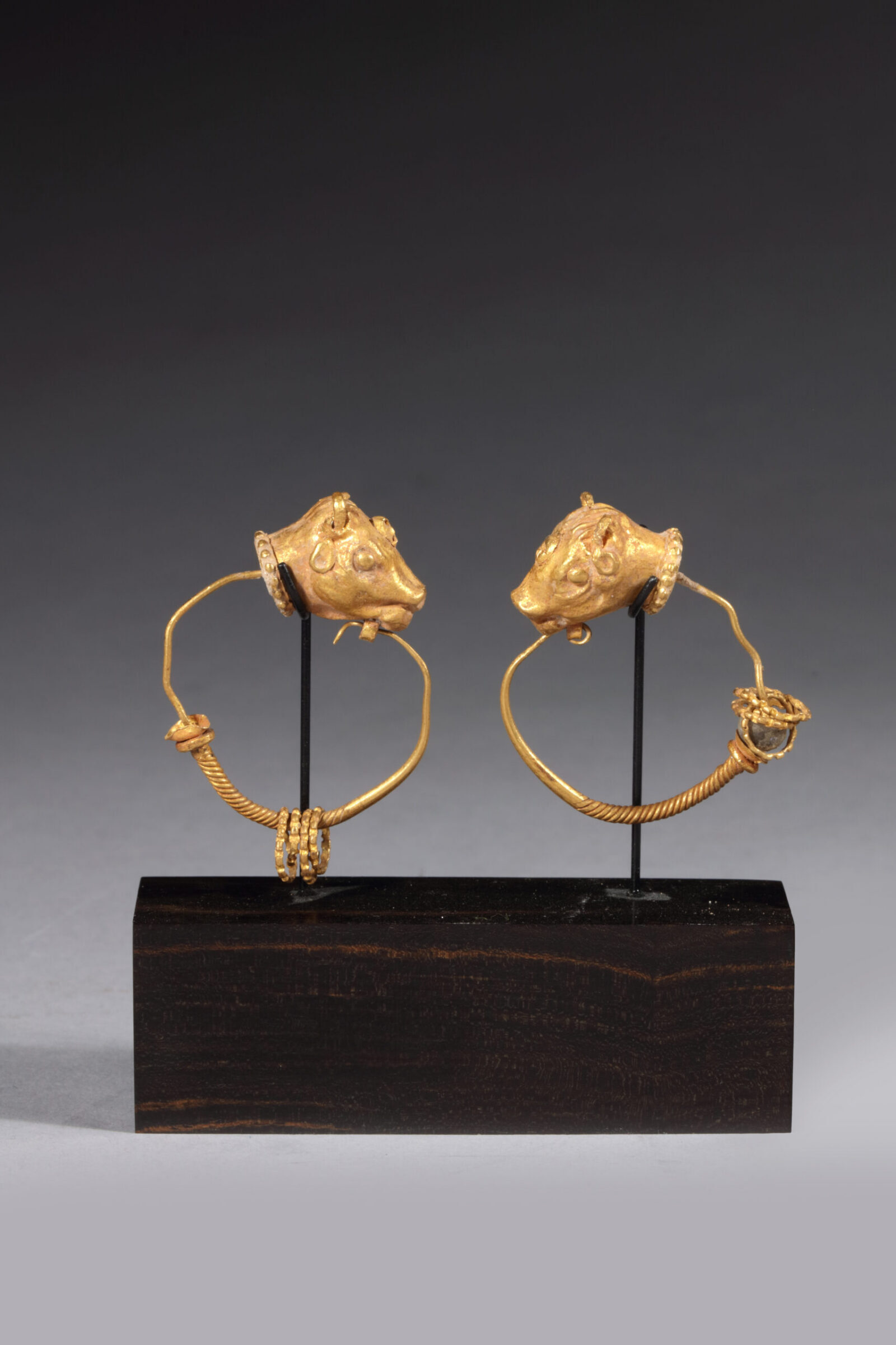 Large rings, partly twisted, adorned with tiny ‘ribbed’ rings, one with extra glass bead, terminating in small loop at underside of quite large bull’s head with rounded bulging eyes, tiny horns and dotted relief band at base of neck.