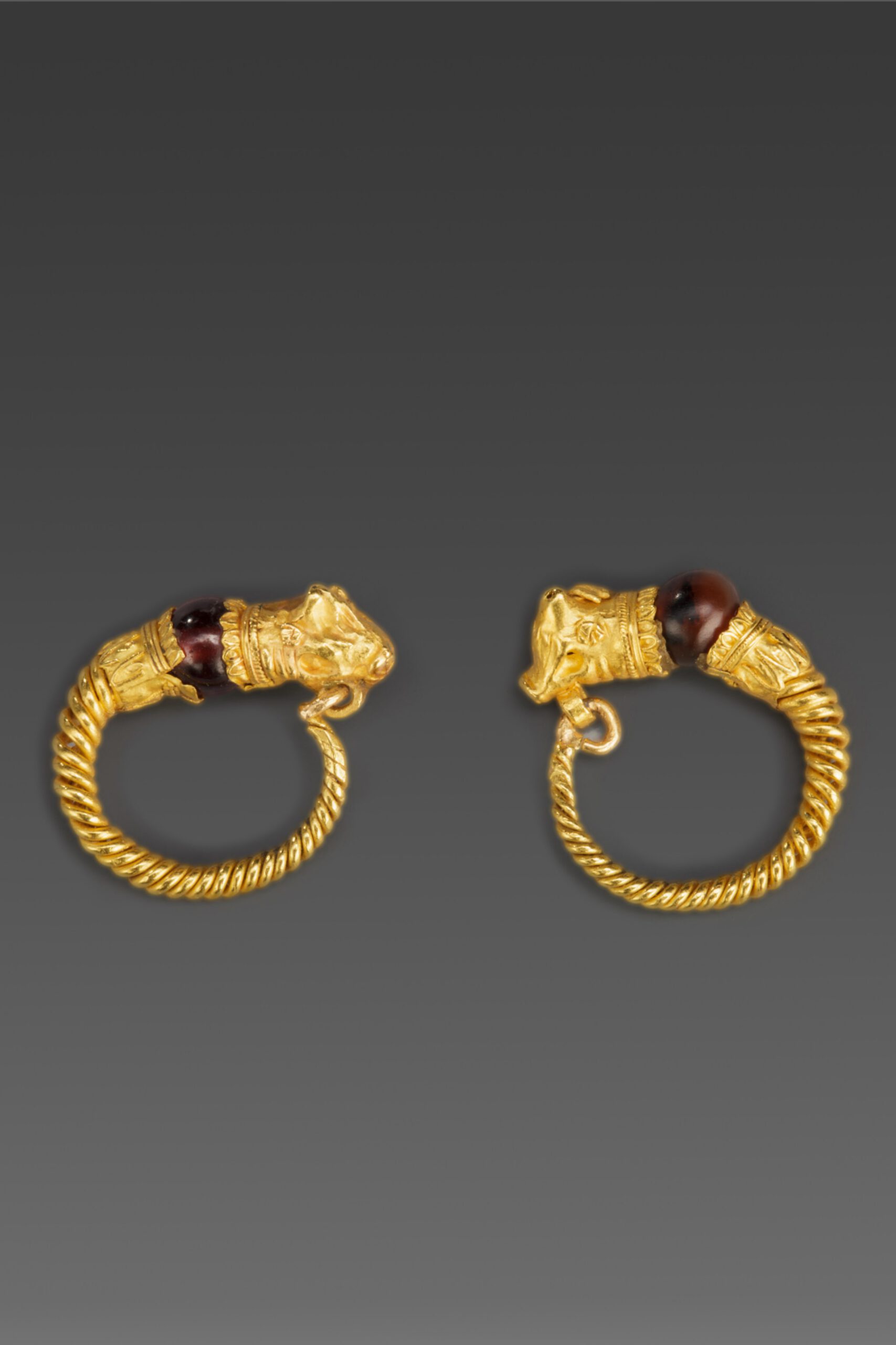 Hoop is formed of coiled wires tapering to the end to be hooked into a loop, other end consisting of ornamental collar, garnet bead and head of calf; meant to wearing upside down