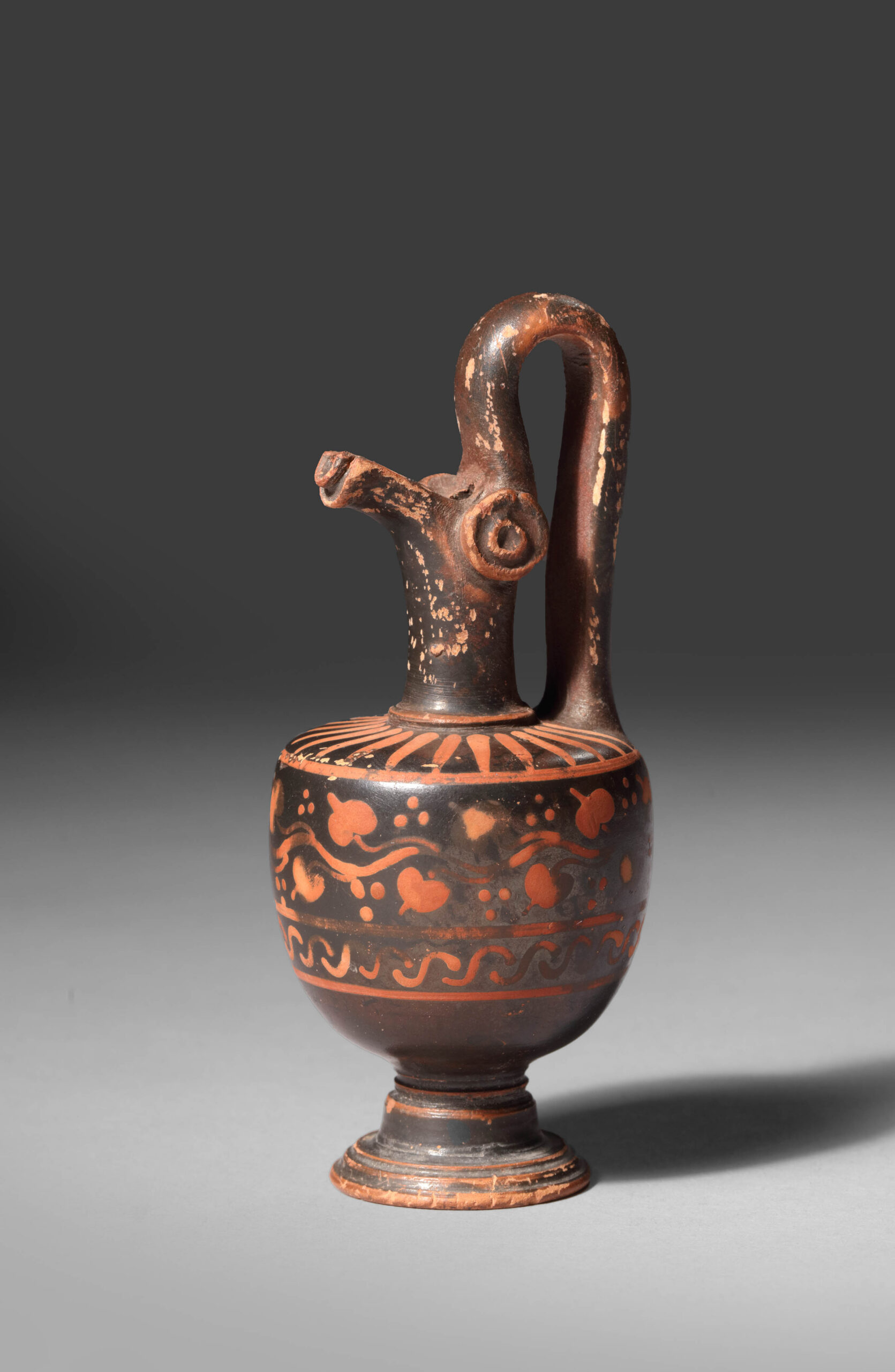 Added red figure decoration of ivy tendrils on body, rays on flattened shoulder, high handle, beaked mouth with discs